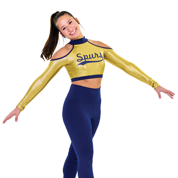 Cold shoulder crop top with accenting trim around the shoulders and bottom band. Price does not include the chest design.